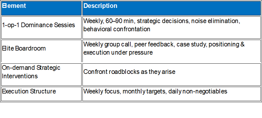 Through intake, diagnostics, mentorship, and execution, we focus on results, not theory. Mediocrity is not an option — only real, measurable results.