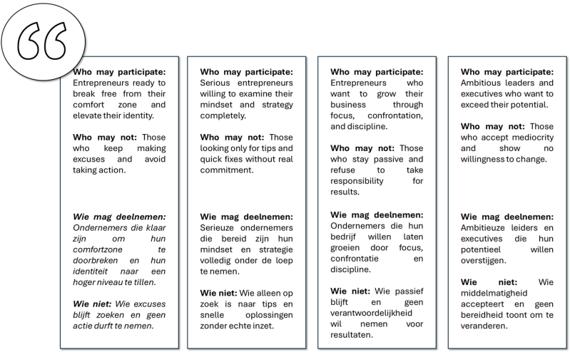 Wij nodigen u uit voor een speciale VIP-sessie met onze TOP Succesmentor. Met meer dan 25 jaar bewezen ervaring in het begeleiden van individuen, ondernemers en bedrijfsleiders naar hun hoogste potentieel, biedt onze mentor inzichten, strategieën en praktische tools die werkelijk ongeëvenaard zijn in de branche.
